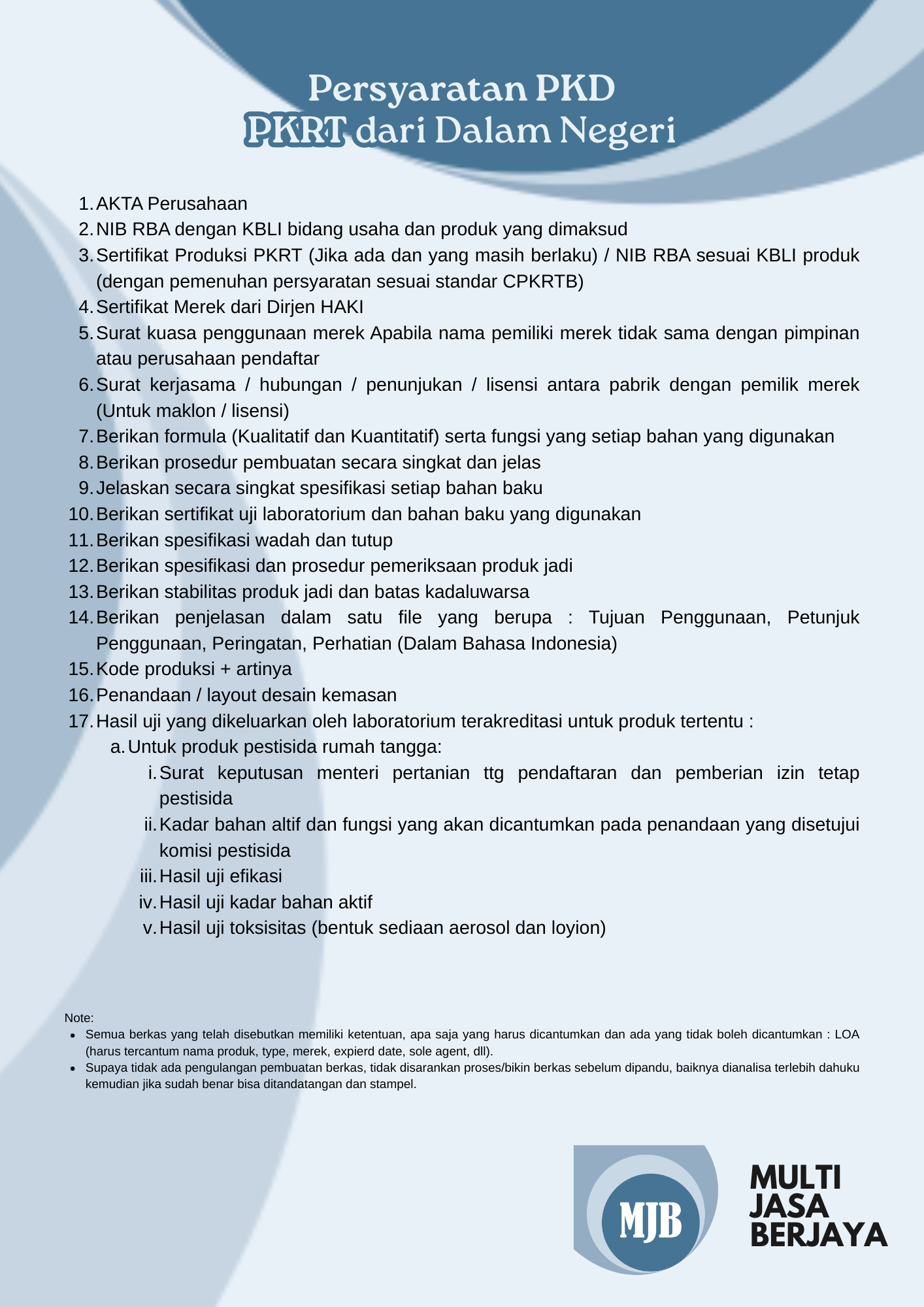 PT Multi Jasa Berjaya melayani pengurusan legalitas usaha secara resmi, meliputi perizinan alat kesehatan, PKRT, obat-obatan, serta berbagai jenis sertifikat Distribusi maupun Produksi dan izin operasional lainnya seperti pendirian PT/CV, sertifikat CDAKB, CPAKB, CPPKRTB, CDOB, CPOB hingga pengurusan sertifikat halal, sertifikat ISO dan legalitas pertanahan sesuai ketentuan pemerintah.
