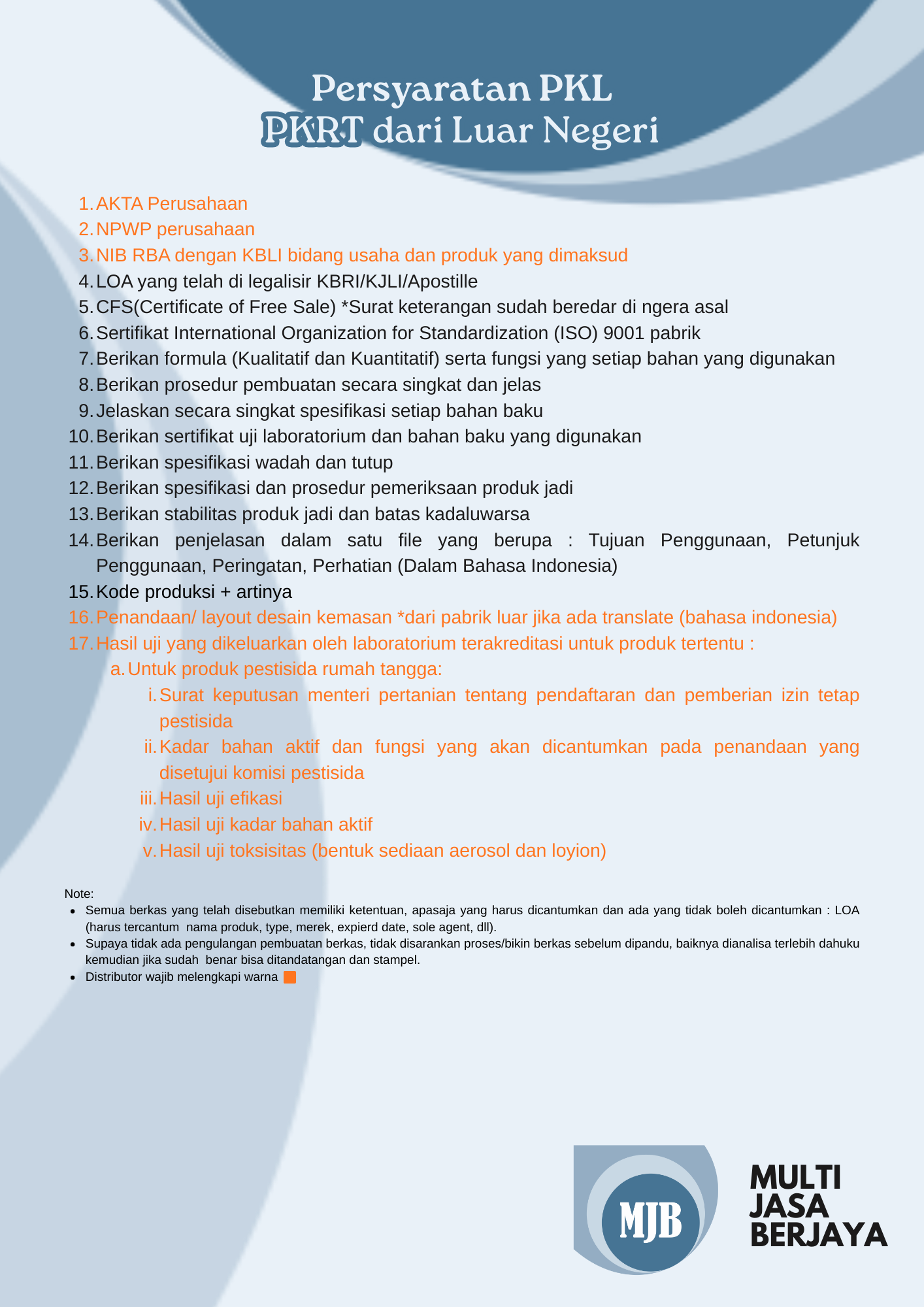 PT Multi Jasa Berjaya adalah perusahaan yang bergerak di bidang Perizinan Usaha khususnya izin edar/produksi Alat kesehatan dan PKRT.